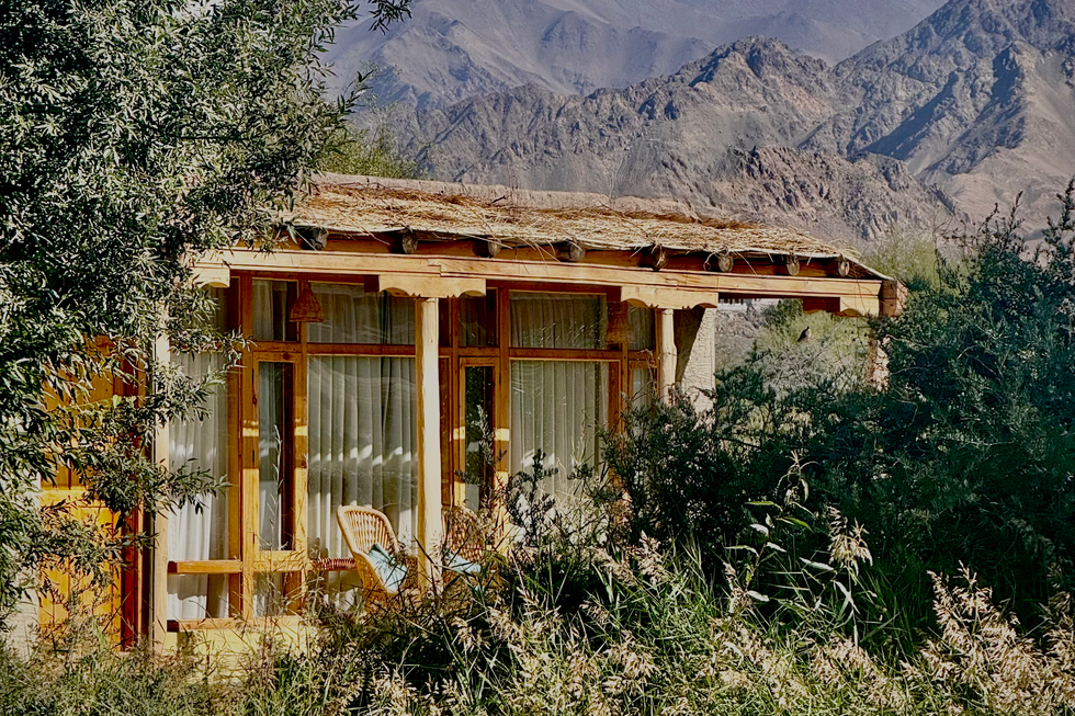 The rooms are built primarily with sun-baked mud bricks, glass, and wood, locally sourced from Leh and the surrounding area.